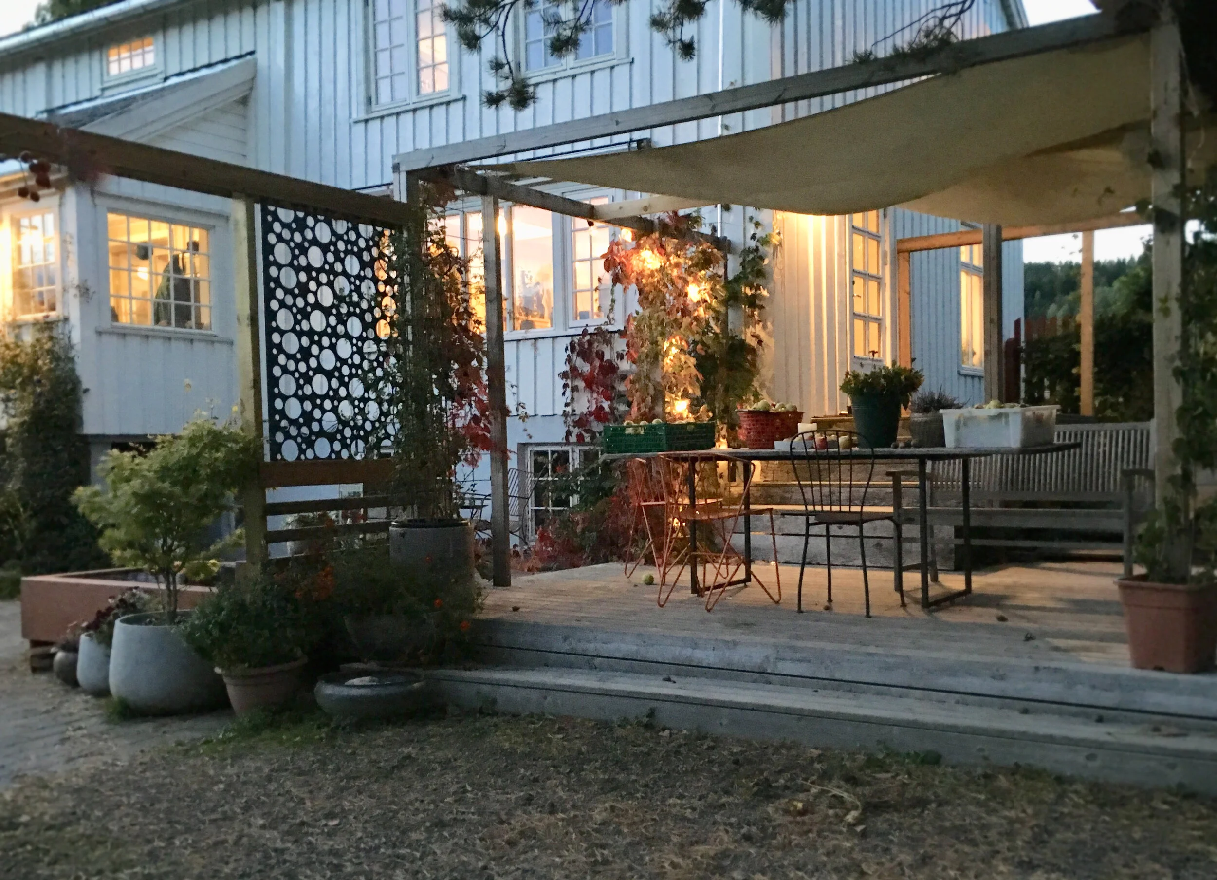 Dette er min egen hage på Monsås, Torvika. Vi bor på en slektsgård med våningshus, fjøs, stabbur og sag. Hagen er en brukshage for familien med kjøkkenhage, uteplass med pizzaovn, uteplass for utleie enhet, bær-og frukthage og ulike avdelinger med staudebed.
